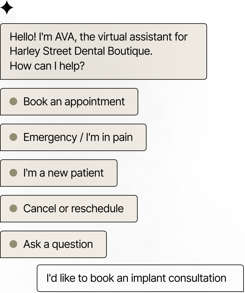Watch AVA capture an enquiry, qualify a patient and book a confirmed appointment. Live. No slides.